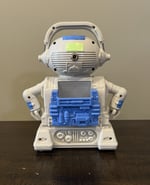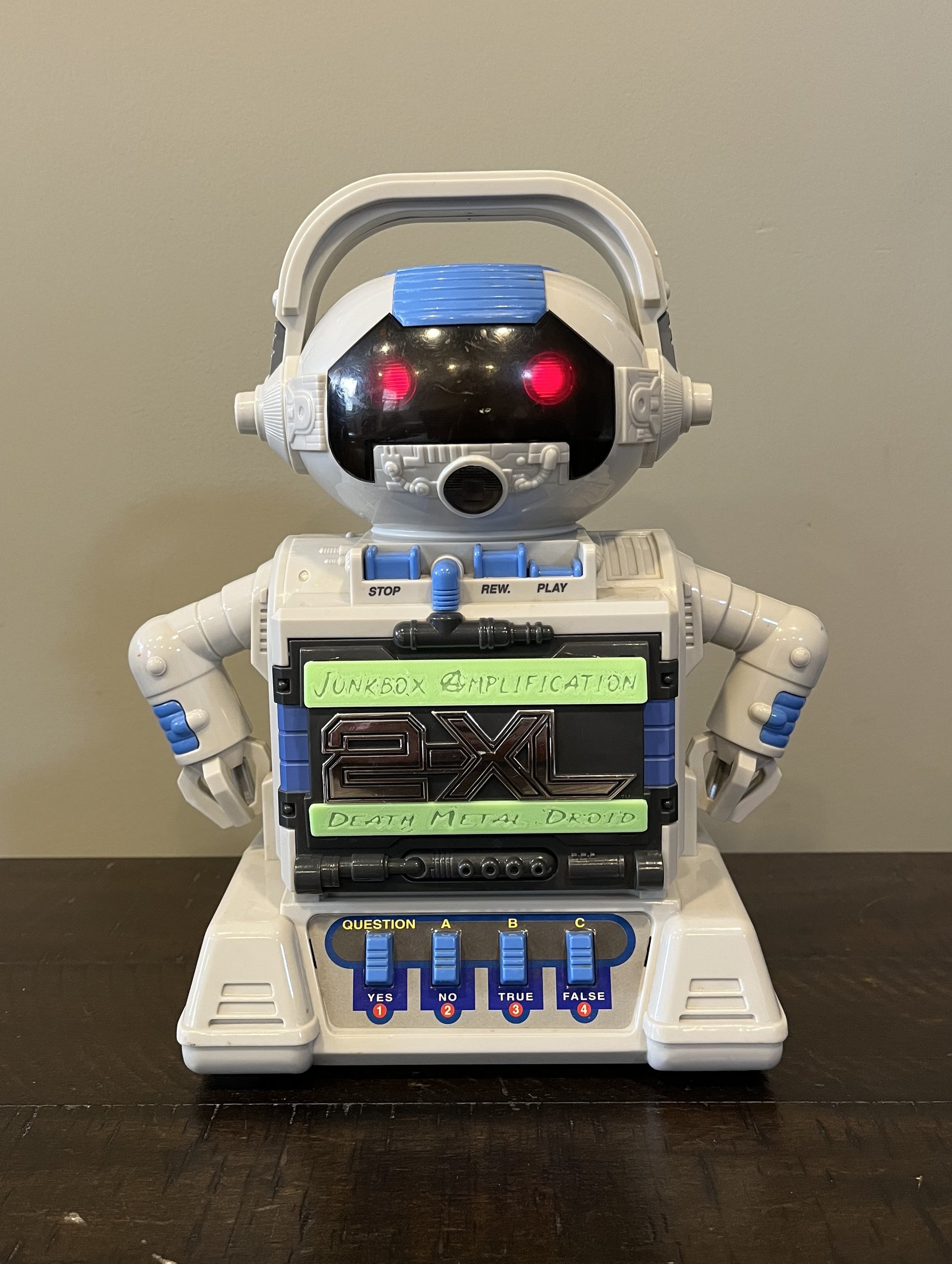 Introducing the Death Metal Droid! Death Metal Droid doesn't fuck around, the tone is saturated, raunchy, and feedback prone. This unit is not particularly loud but can hold it's own playing nasty leads or raw power chords over an acoustic guitar. Show up to the next acoustic jam with your buddies with your electric guitar and the Death Metal Droid and melt some faces! This unit features flashing red led eyes and and a red led that illuminates in the Droid's mouth when the guitar is being played. It runs off of 4 D Cell Batteries (not included) or it can run off the included 6 volt power supply. See videos of Death Metal Droid Junkbox #92 on the Junkbox Amplification Instagram or TikTok pages.