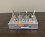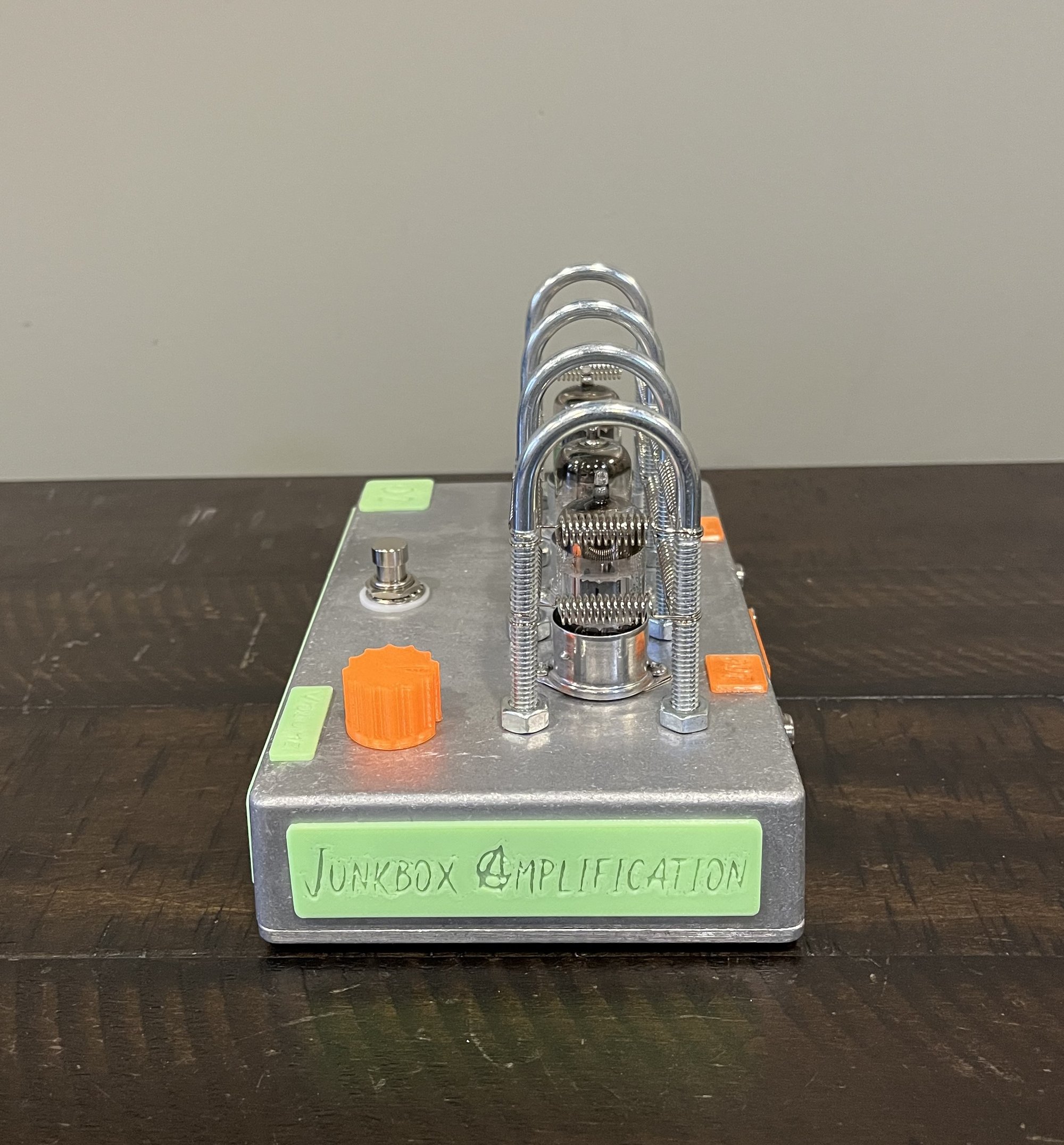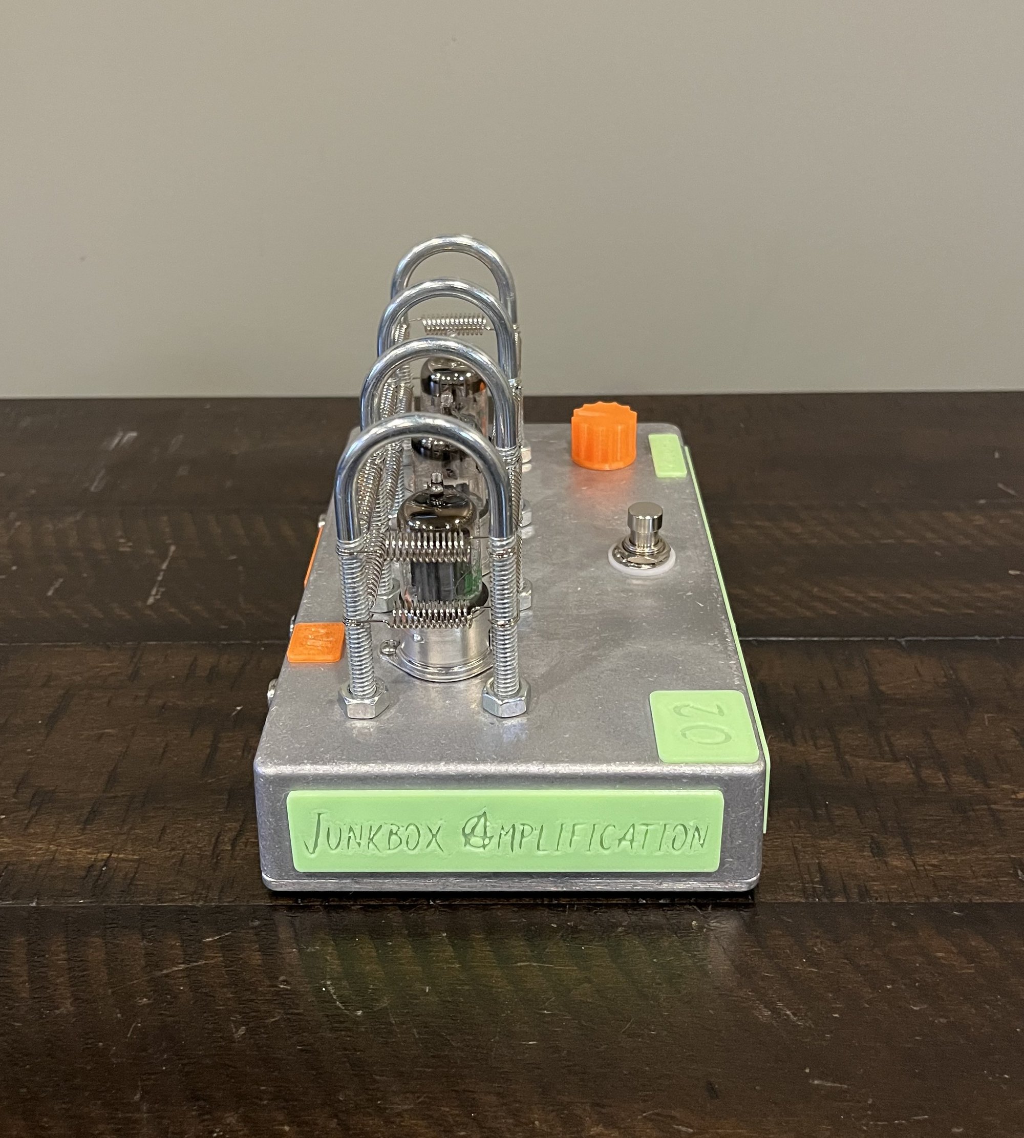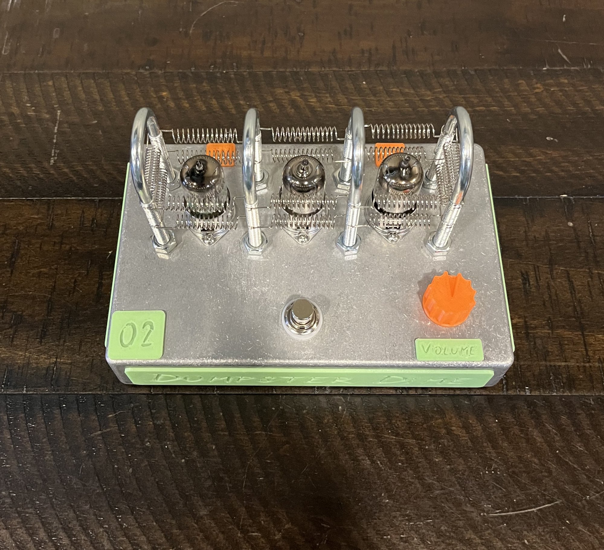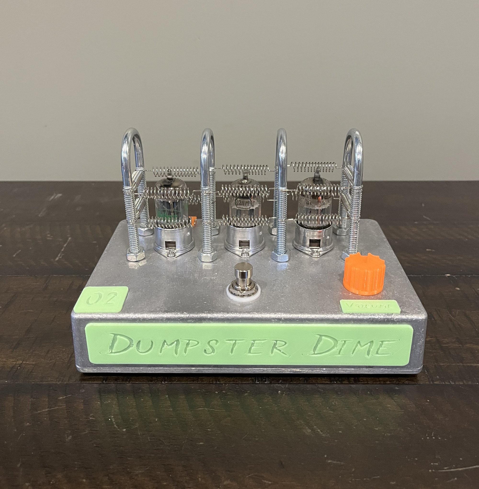 Introducing the Dumpster Dime! Powered by three vintage 12AV7 vacuum tubes, this pedal is Junkbox Amplification's modified and enhanced circuit based on the Valvecaster. The Dumpster Dime is the Dumpster Dive on steroids! When the single footswitch is activated, the three vacuum tubes roar to life in cascade of gain and saturation. Instead of using potentiometers to control the gain, fixed resistors are used to maximize the gain of each tube to produce an incredible overdriven tone. A volume knob is used to control the pedal output volume. That's all there really is too it. The Dumpster Dime is simple, no bullshit, and 100% rock n roll! Three orange led's are installed at the base of each tube socket and illuminate the tubes the foot switch is activated.