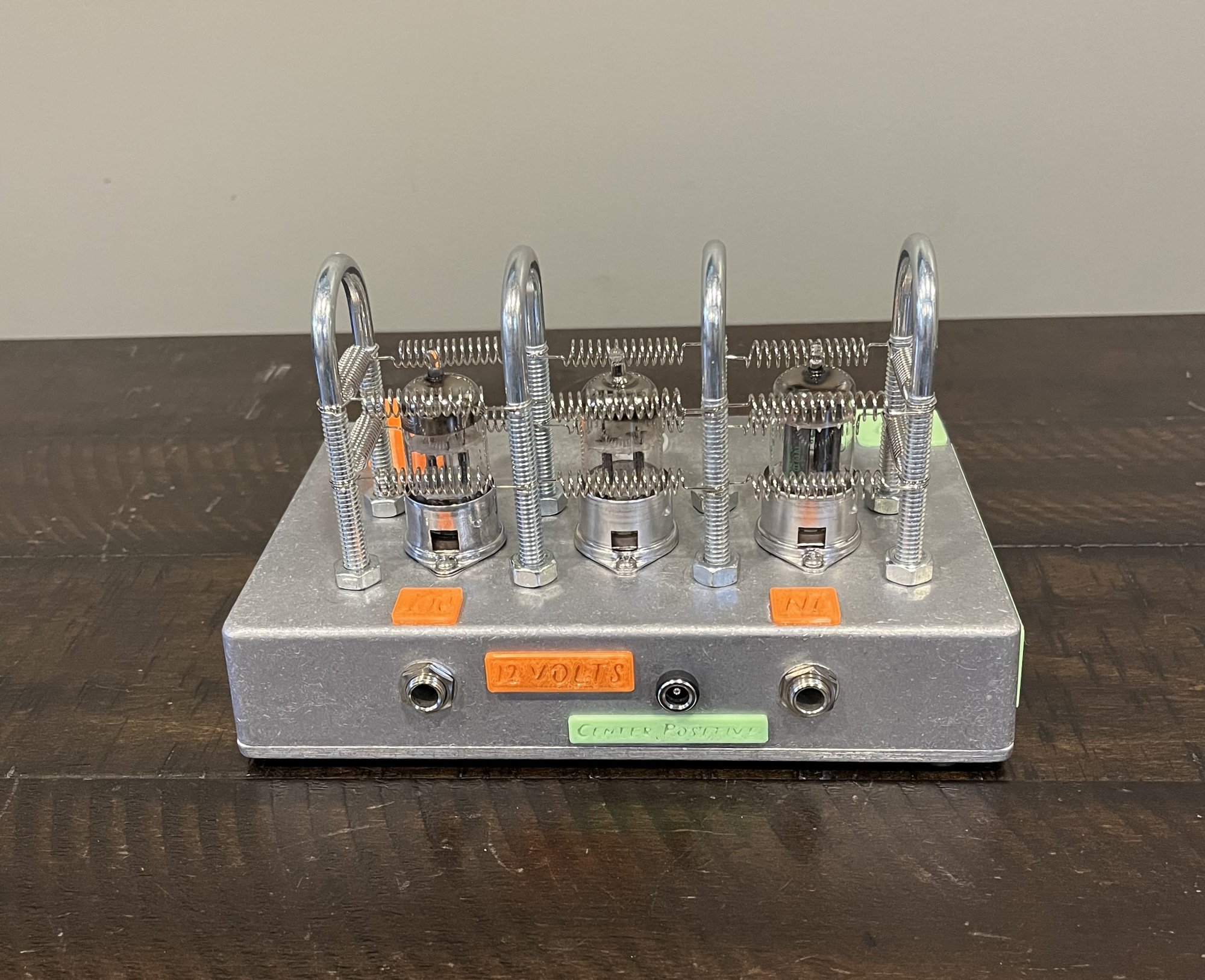 This pedal runs on 12 volts DC, power supply included. This pedal is hand drilled and and hand point to point wired (no PCB's) by me one at a time. Since this pedal is point to point wired it is easily repairable when components wear out over time. The control knobs and labels are 3d printed in house. The U-bolt and extension spring tube cage protect the 12AV7 tubes from damage and the design draws its inspiration from early 1900's industrial motif.