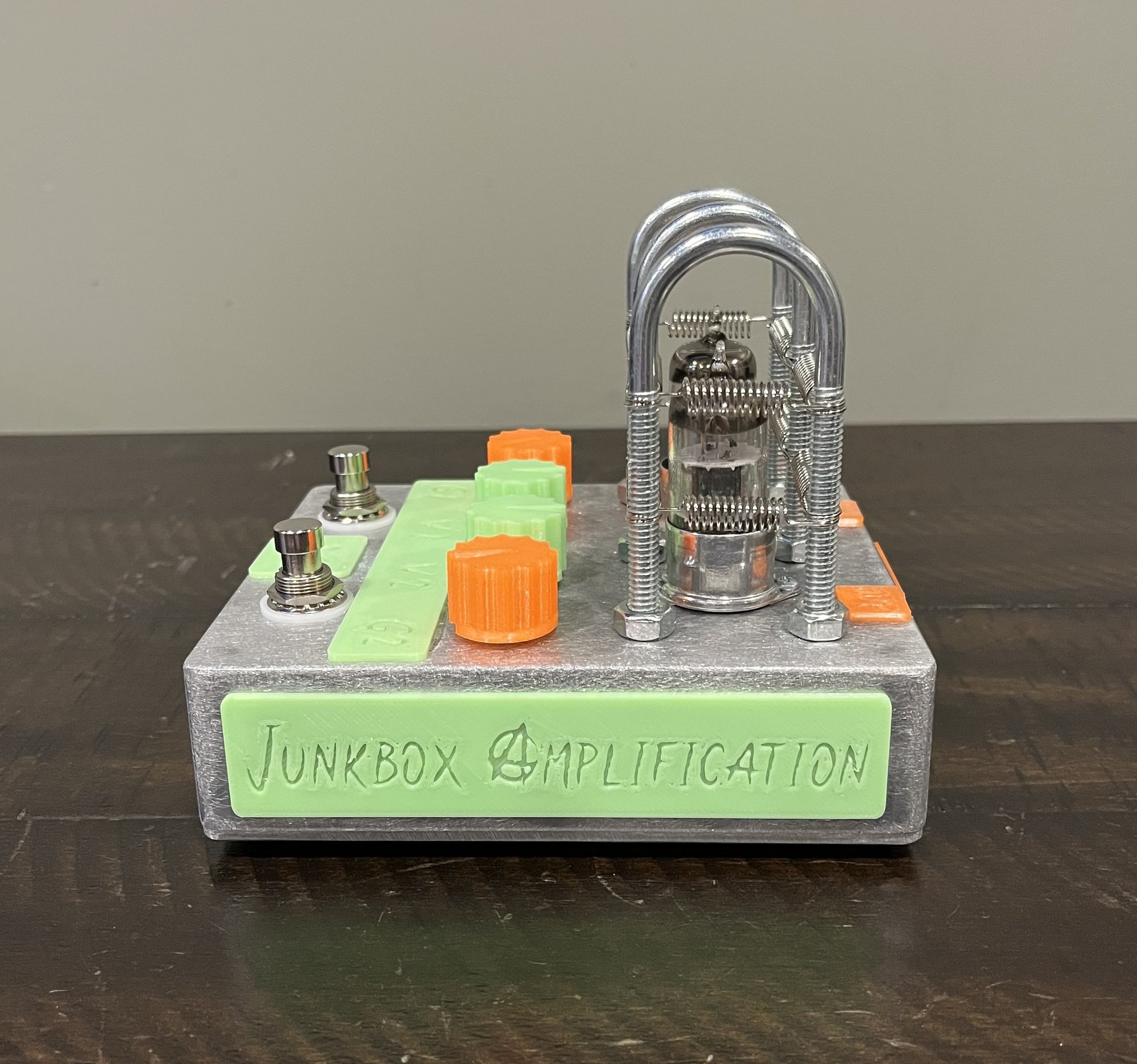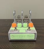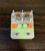 Introducing the Dumpster Dive! Powered by two vintage 12AV7 vacuum tubes, this pedal is Junkbox Amplification's modified and enhanced circuit based on the Valvecaster. Each footswitch activates a 12AV7 tube. Activating one of the tubes produces a warm gritty boost that is excellent for rhythm playing and beefing up riffs. Activate a second tube for a hot searing tone for lead playing. The Dumpster Dive features a gain control and volume control for each tube. Play with the settings for both tubes to dial in different tones. Two orange led's are installed at the base of the tube socket and illuminate when each tube is incorporated into the circuit via a foot switch.