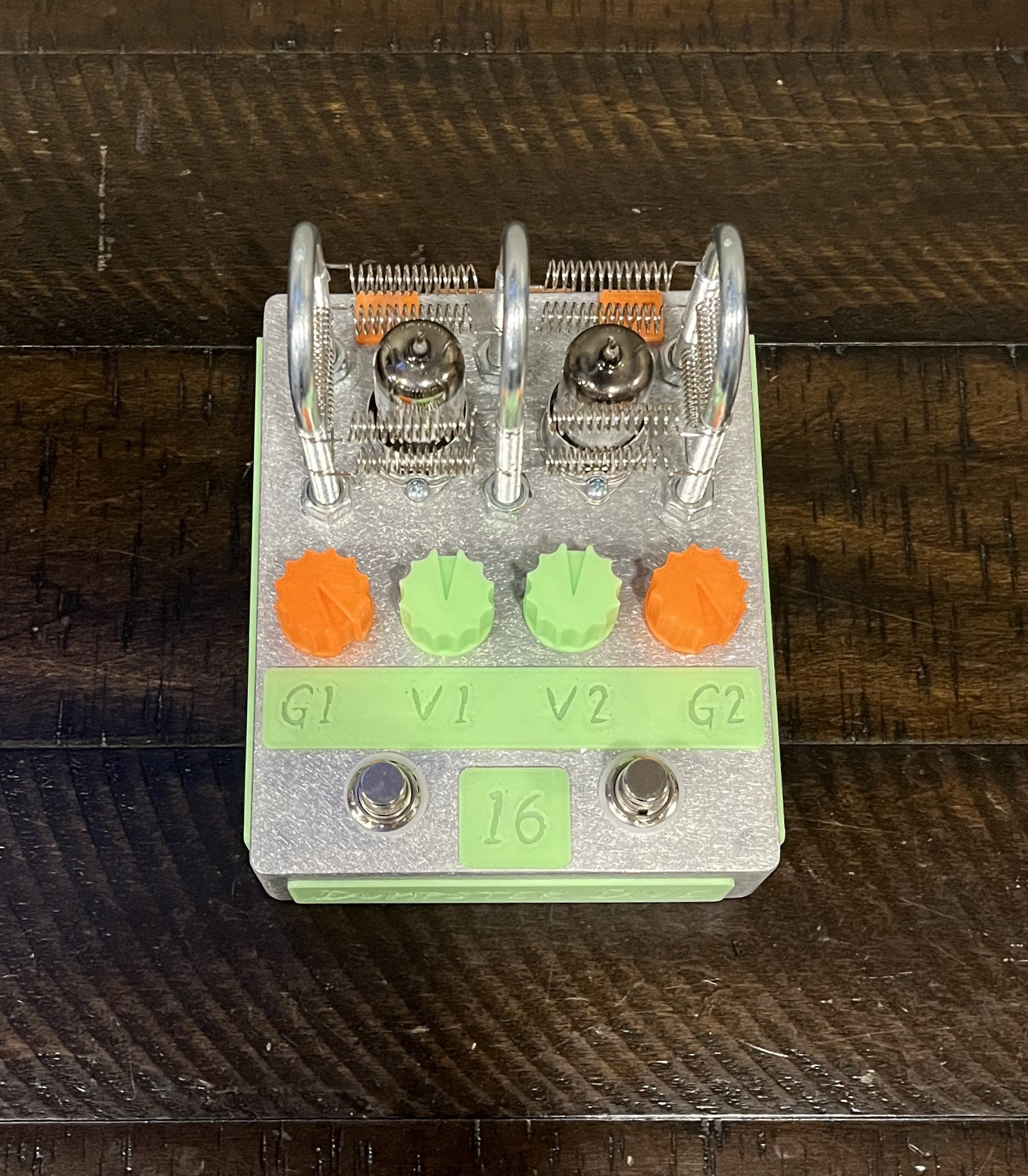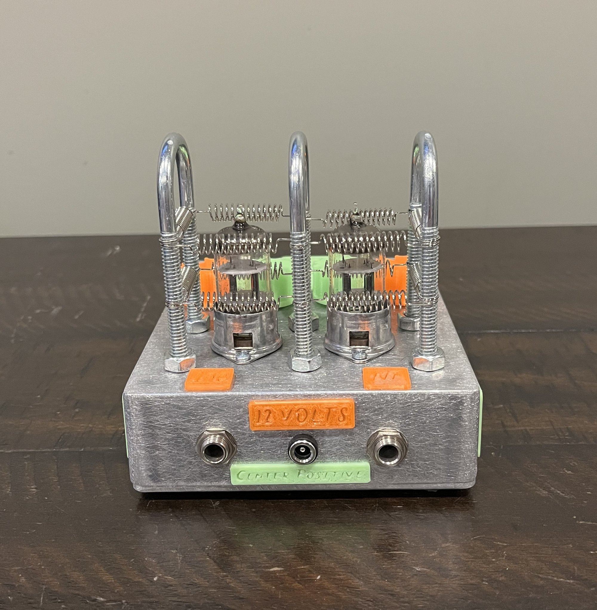 This pedal runs on 12 volts DC, power supply included. This pedal is hand drilled and and hand point to point wired (no PCB's) by me one at a time. Since this pedal is point to point wired it is easily repairable when components wear out over time. The control knobs and labels are 3d printed in house. The U-bolt and extension spring tube cage protect the 12AV7 tubes from damage and the design draws its inspiration from early 1900's industrial motif.
