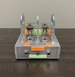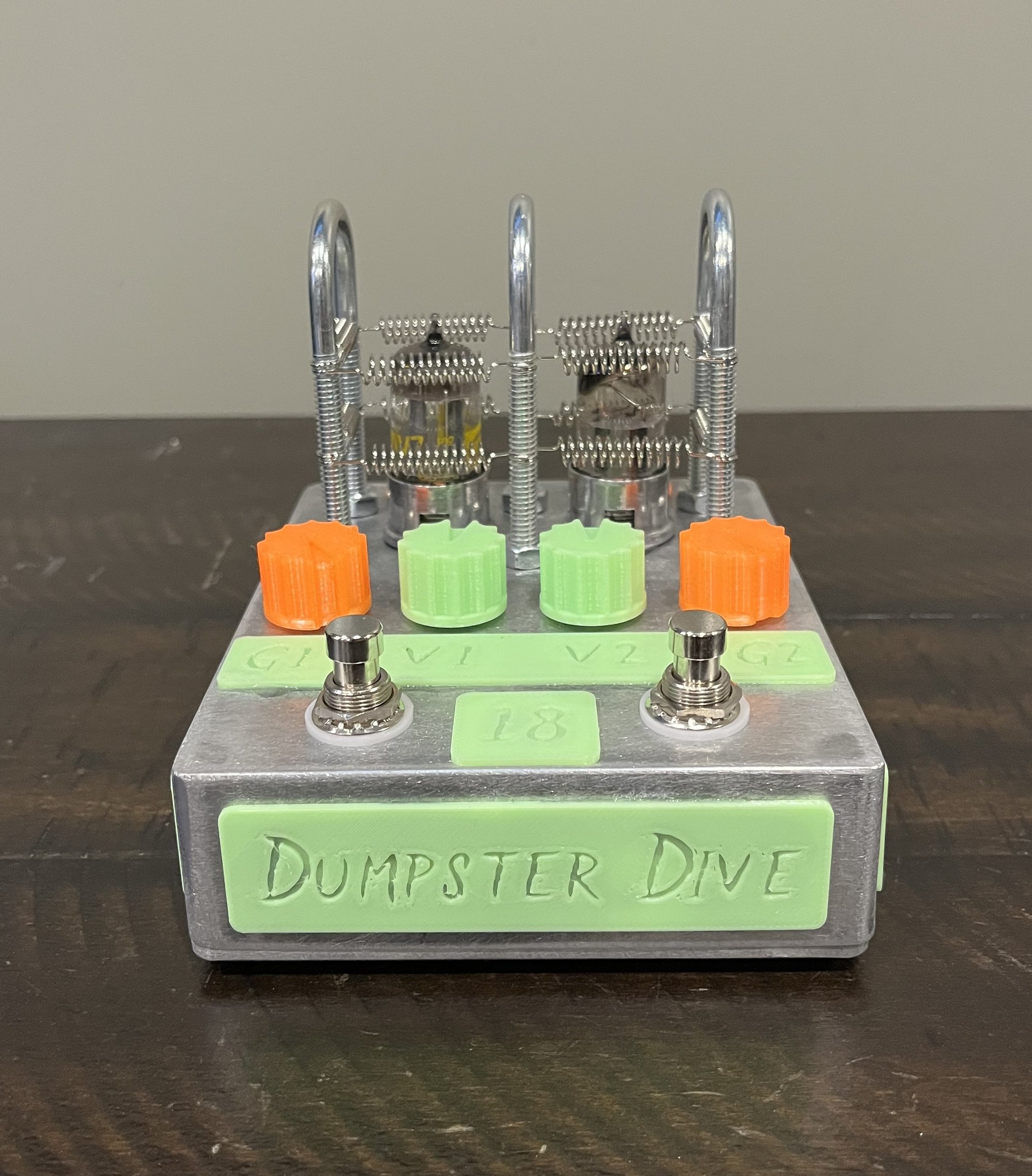 Introducing the Dumpster Dive! Powered by two vintage 12AV7 vacuum tubes, this pedal is Junkbox Amplification's modified and enhanced circuit based on the Valvecaster. Each footswitch activates a 12AV7 tube. Activating one of the tubes produces a warm gritty boost that is excellent for rhythm playing and beefing up riffs. Activate a second tube for a hot searing tone for lead playing. The Dumpster Dive features a gain control and volume control for each tube. Play with the settings for both tubes to dial in different tones. Two orange led's are installed at the base of the tube socket and illuminate when each tube is incorporated into the circuit via a foot switch.