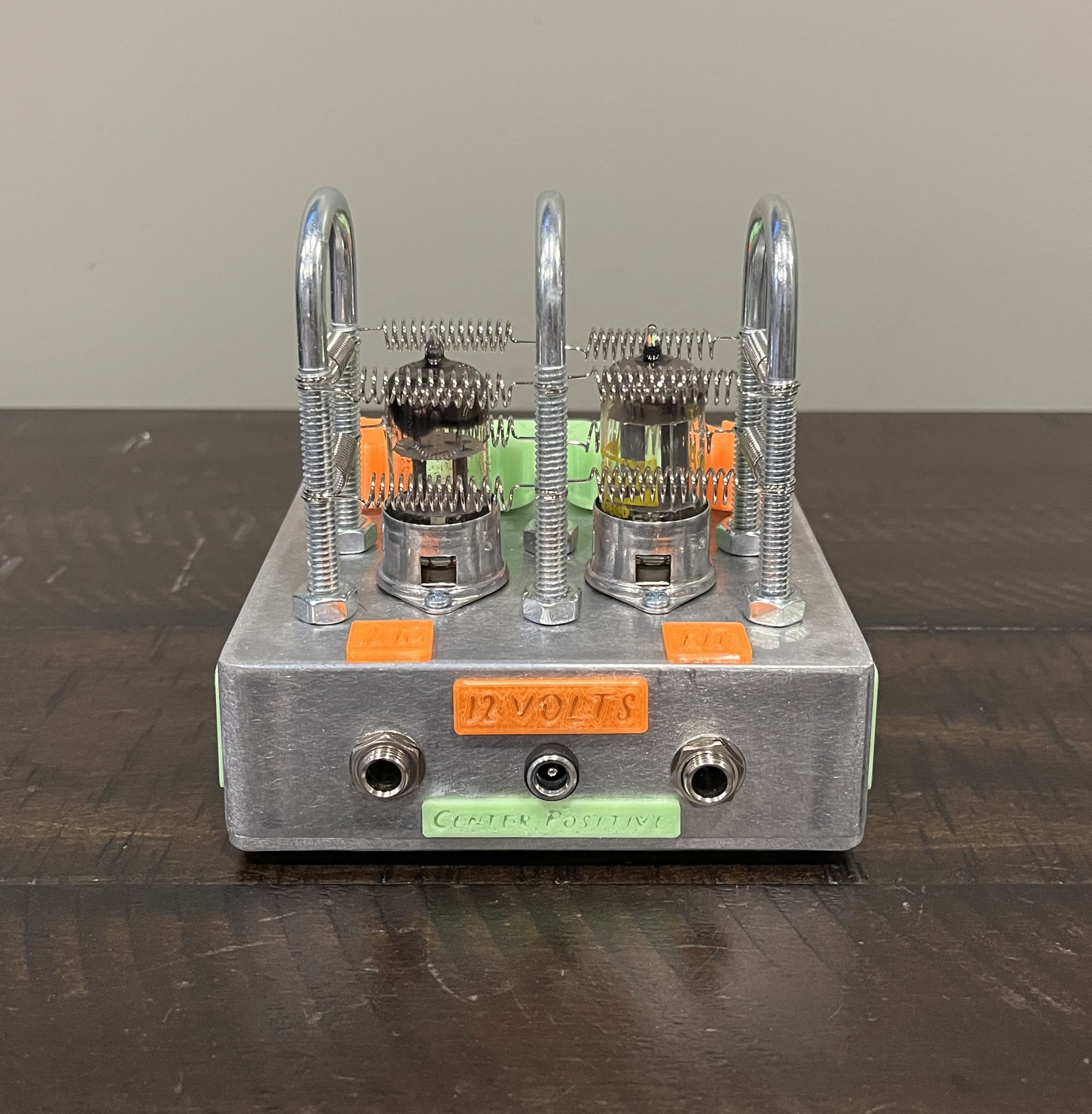 This pedal runs on 12 volts DC, power supply included. This pedal is hand drilled and and hand point to point wired (no PCB's) by me one at a time. Since this pedal is point to point wired it is easily repairable when components wear out over time. The control knobs and labels are 3d printed in house. The U-bolt and extension spring tube cage protect the 12AV7 tubes from damage and the design draws its inspiration from early 1900's industrial motif.