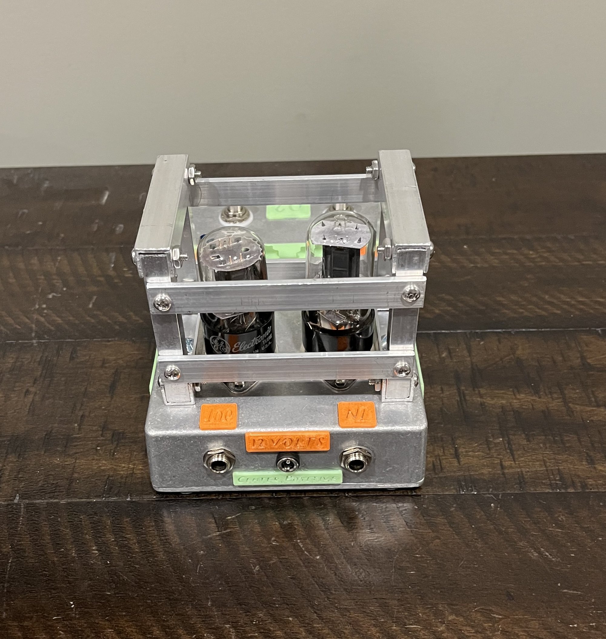 This pedal runs on 12 volts DC, power supply included. This pedal is hand drilled and and hand point to point wired (no PCB's) by me one at a time. Since this pedal is point to point wired it is easily repairable when components wear out over time. The control knobs and labels are 3d printed in house. The tube cage is fabricated out of recycled aluminum stock to protect the 12SN7 tubes from damage and the design draws its inspiration from early 1900's industrial motif.