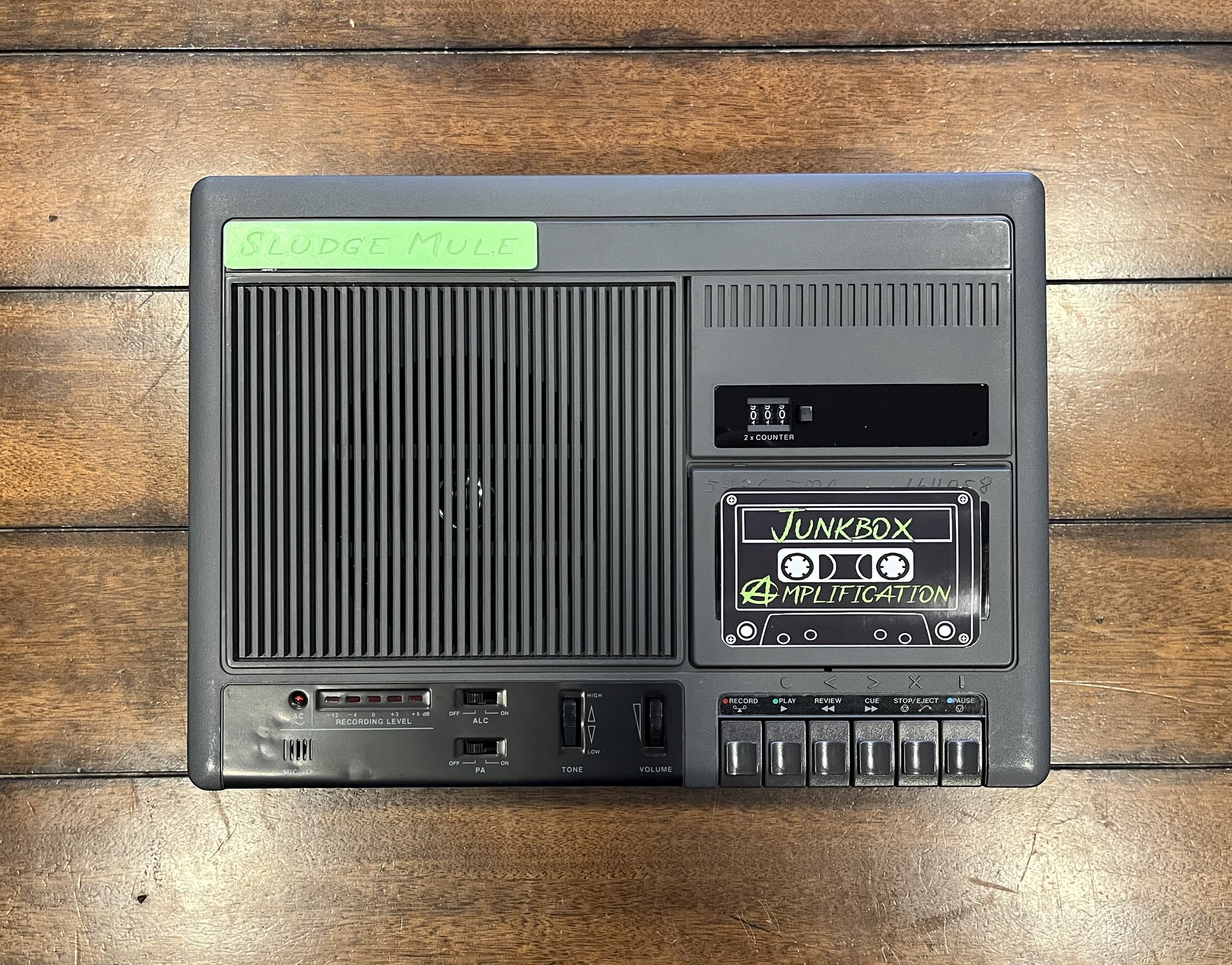 Sludge Mule runs on AC Power only. This unit features a carrying handle that stows conveniently into the unit. The power cord tucks neatly into the units enclosure. Sludge Mule also features 6 mono headphone jack outputs and one mono output jack for a 4 ohm 5-watt minimum extension speaker. See videos of Sludge Mule Junkbox #123 on the Junkbox Amplification Instagram or TikTok pages.